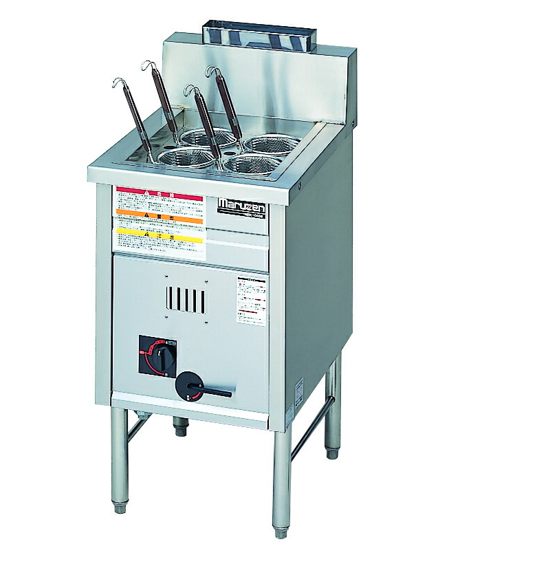 マルゼン独自のホールヒートパイプを採用。熱効率60%を実現した省エネ構造で、抜群の沸騰力を実現しました。大型ゆで槽の採用により、効率よくスピーディーな連続調理を可能にしました。ゆでカゴに熱湯が集中して吹き上がり、めんをほぐしシコッとおいしくゆであげます。排水ハンドルは前面に配置し、操作性も良好です。また槽中央部の加熱パイプには、すき間を持たせてあり、ゆで槽の掃除も楽にできます。口火安全装置付、ワンタッチ自動点火コックを採用。パイプ脚はSUS304を使用しております。