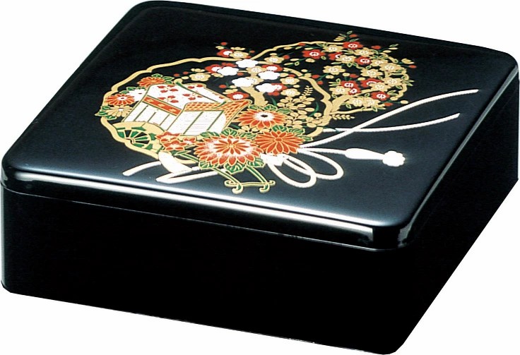 - > 10セット 重箱 1段 6.5寸重1段 黒花御所車(外寸19.6cm角 高さ7.5cm)福井クラフト