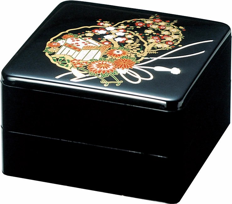 - > 10セット 重箱 2段6.5寸重2段 黒花御所車(外寸19.6cm角 高さ12.5cm)福井クラフト