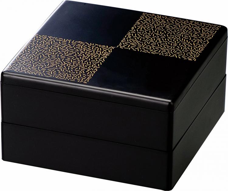 - > 10セット 重箱 2段 6.5寸彩重2段(外寸19.6cm角 高さ11.7cm)艶消黒 地紋金市松 福井クラフト